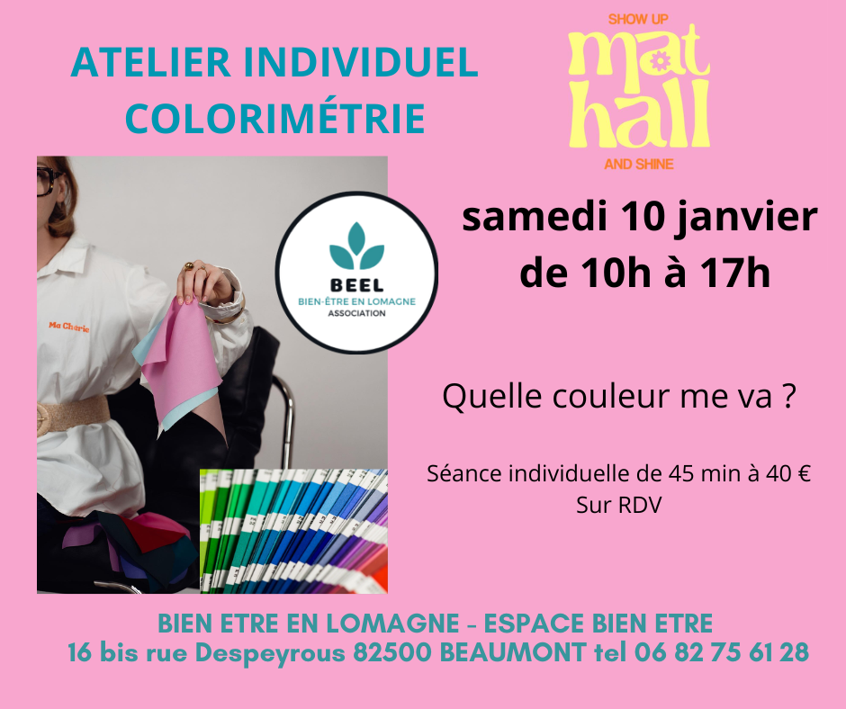 atelier individuel COLORIMETRIE ESPACE BIEN ETRE BEEL face à la poste16 bis rue despeyrous 82500 Beaumont-de-Lomagne