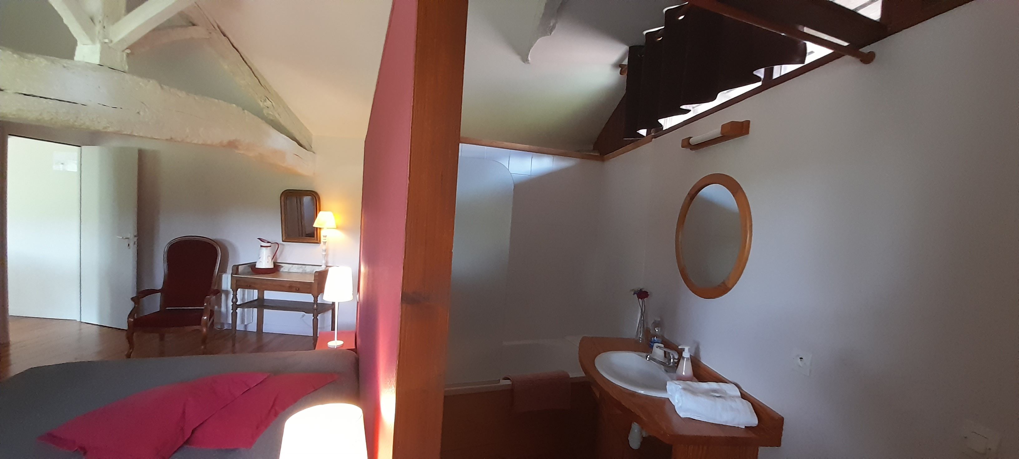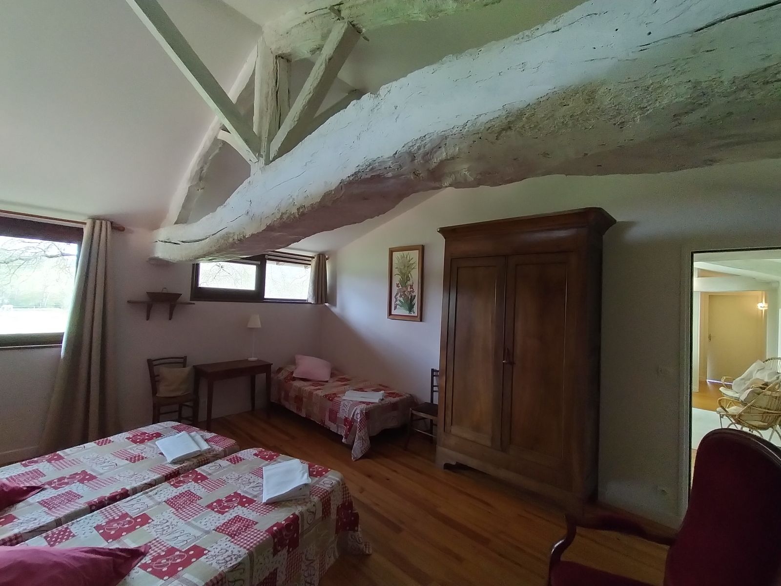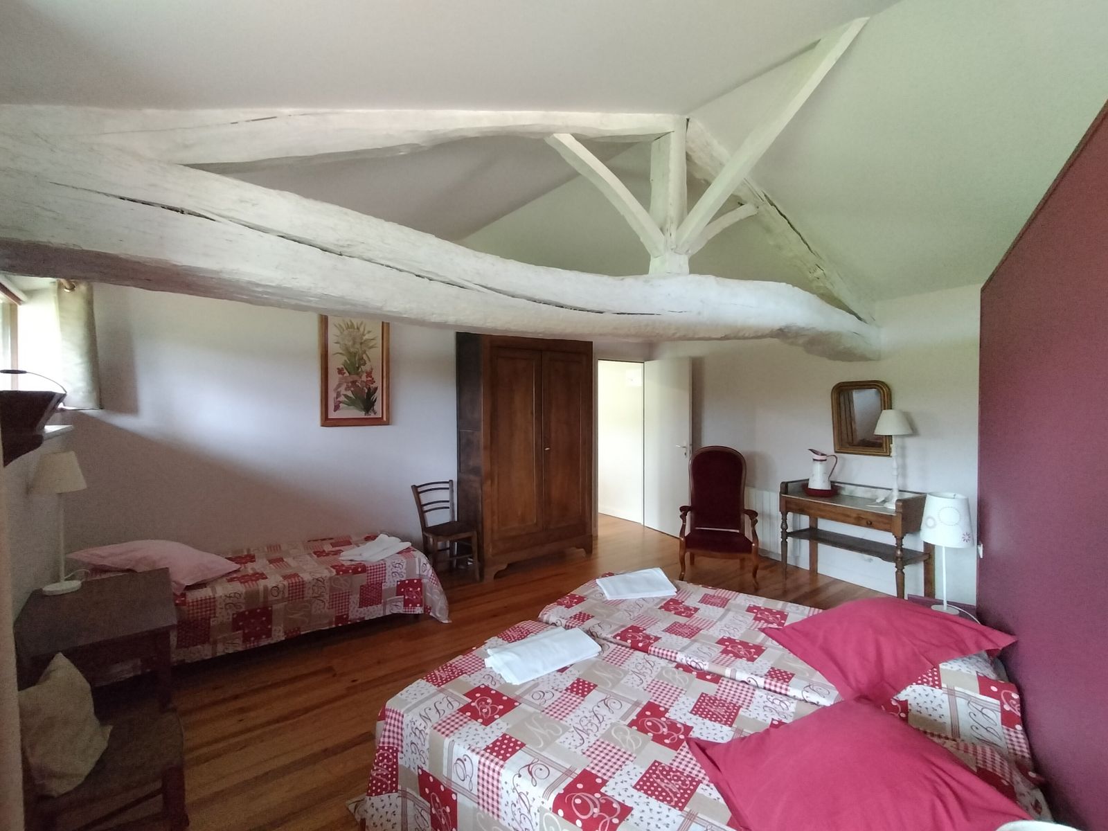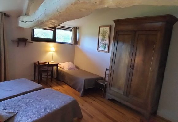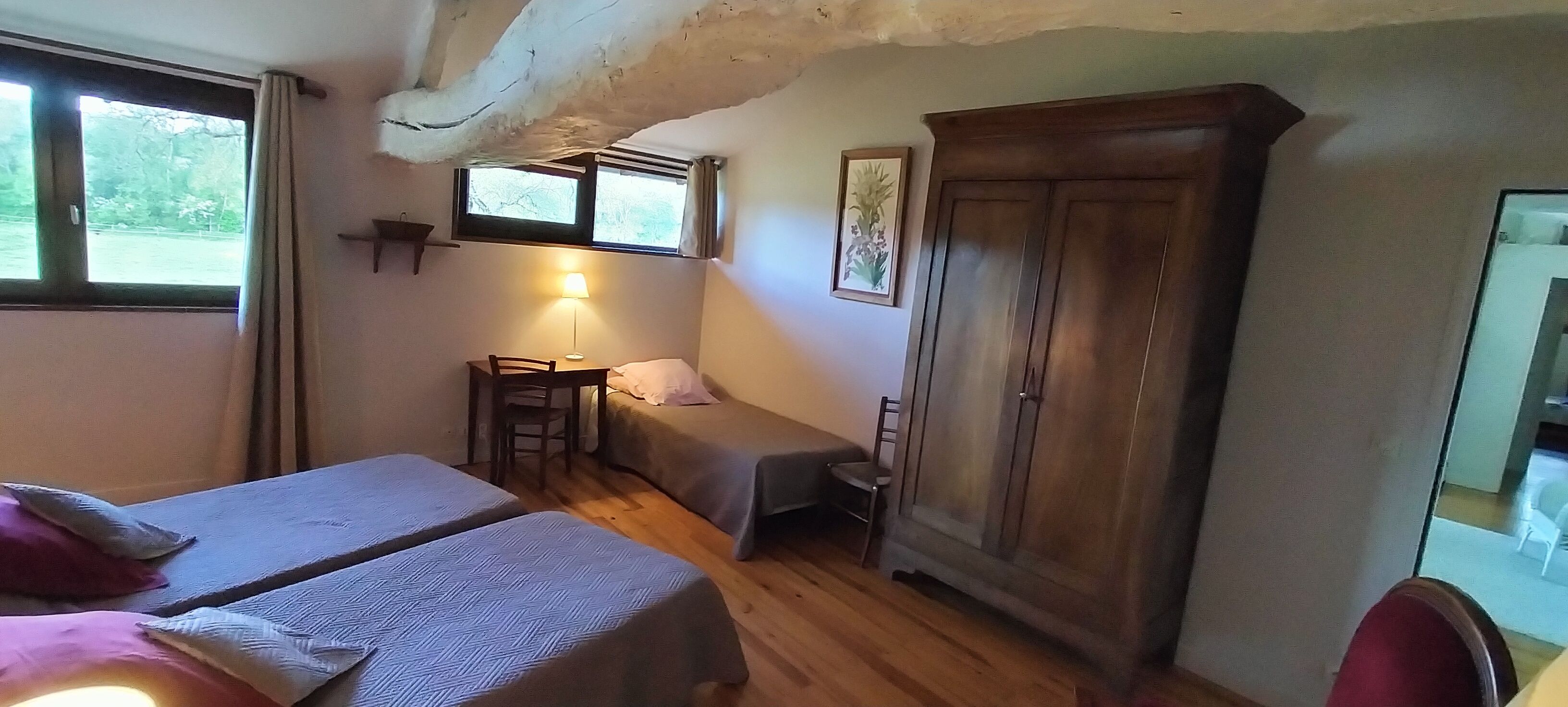 3 fully-equipped guest rooms on the 1st floor of the old stable, which has been completely restored with comfort and charm: 1 bedroom (1×160, shower room/wc), 1 bedroom (1×160, shower room/wc), 1 bedroom (3×90, bathroom/wc). Ground floor: guest lounge, TV. Free WiFi. Summer kitchen (plancha). Garden, covered terrace, deckchairs. Pet pass (3.5 E/night). Children’s meals – 3 years: free, 3 to 12 years: 12.50E.