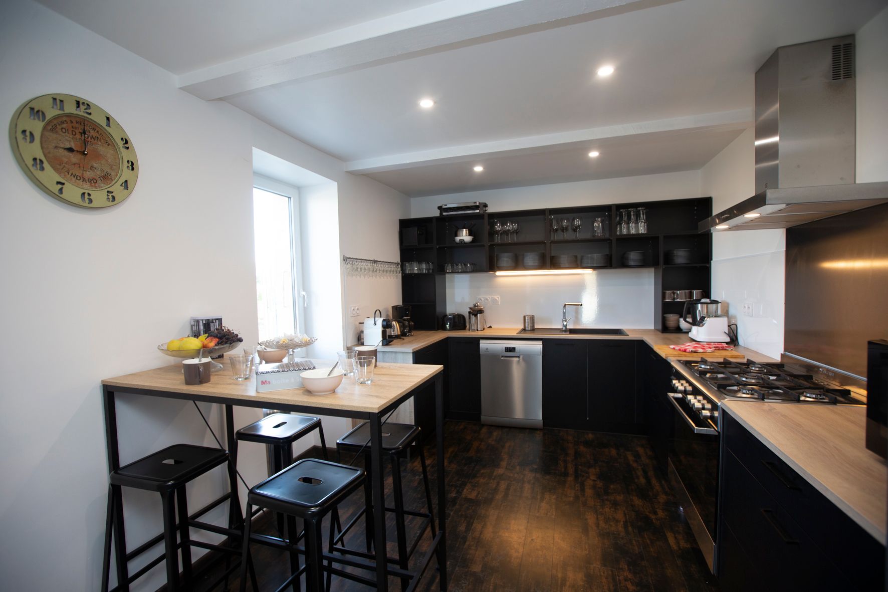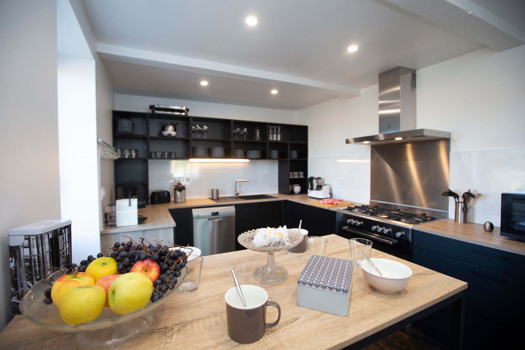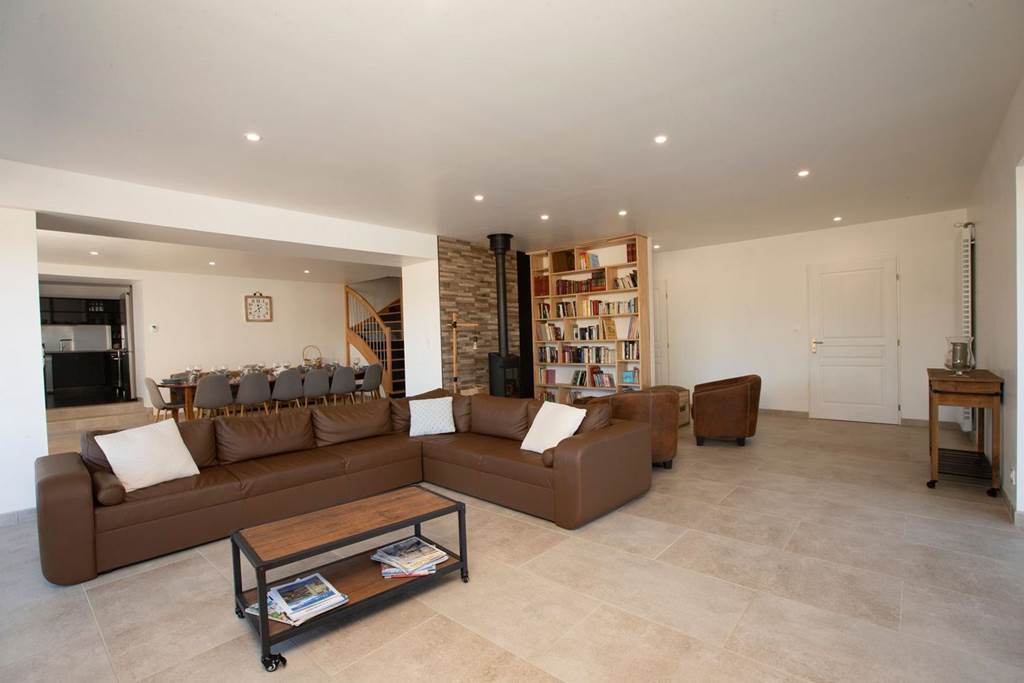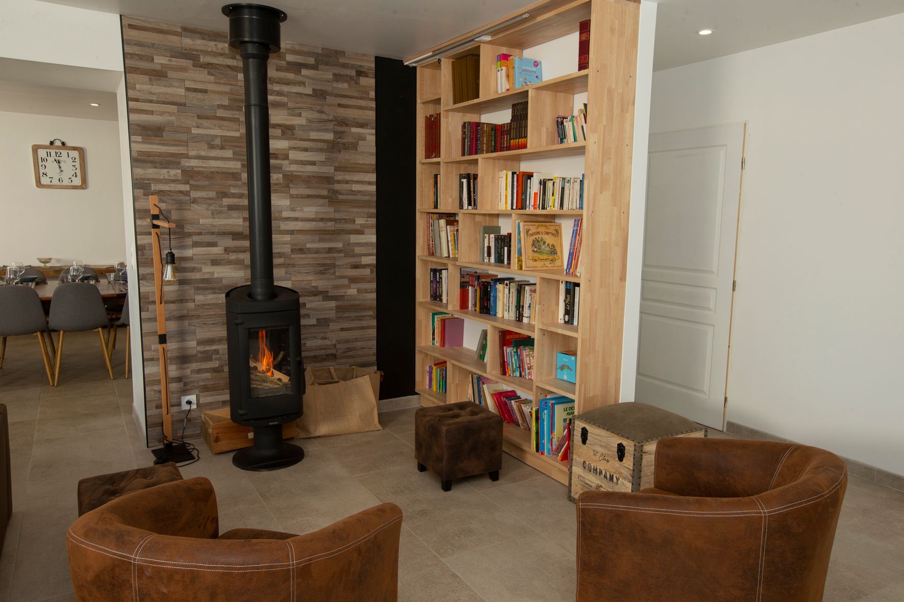 Ground floor: 1 large living room with 1 living room (corner sofa, TV), dining area (table and chairs for 14 people), library area with wood stove, kitchen (built-in elements, 1 cooking piano with oven XL, LV, fridge, freezer), 1 laundry room (dryer, washing machine), 1 accessible toilet, 1 bedroom (1 double bed) accessible to people with reduced mobility with private bathroom.