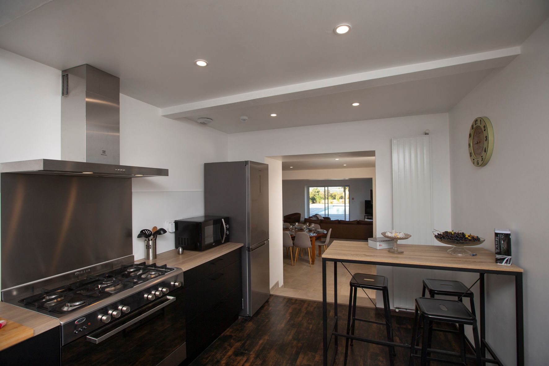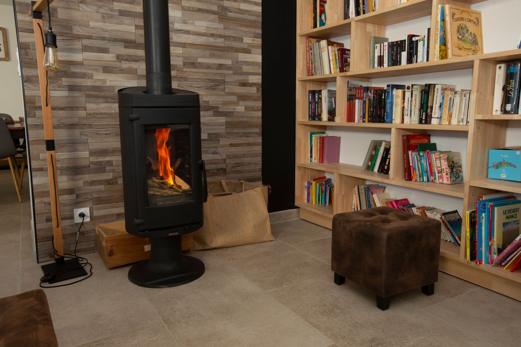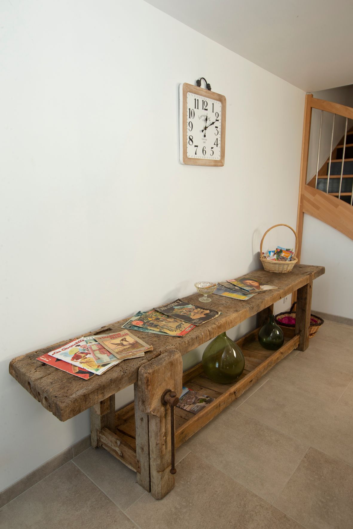 Ground floor: 1 large living room with 1 living room (corner sofa, TV), dining area (table and chairs for 14 people), library area with wood stove, kitchen (built-in elements, 1 cooking piano with oven XL, LV, fridge, freezer), 1 laundry room (dryer, washing machine), 1 accessible toilet, 1 bedroom (1 double bed) accessible to people with reduced mobility with private bathroom.