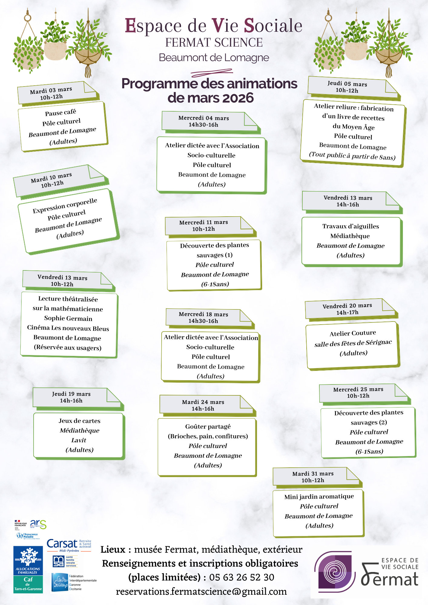 Ateliers EVS – Programme Mars 2026 Maison Fermat3 rue Fermat 82500 Beaumont-de-Lomagne