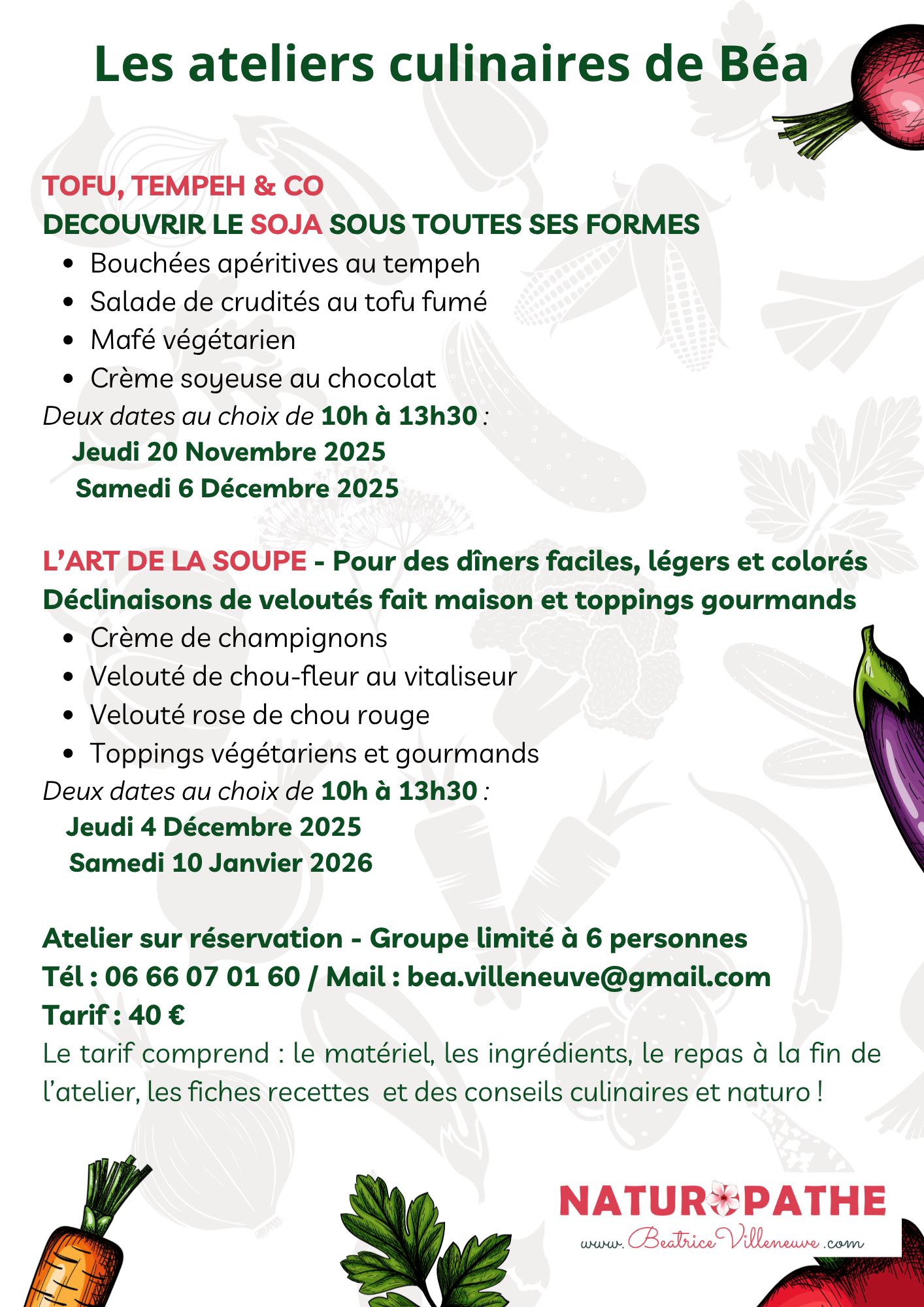 Les ateliers culinaires de Béa “l’art de la soupe” Naturopathe Beatrice VilleneuveLe grand Breton 82500 Beaumont-de-Lomagne