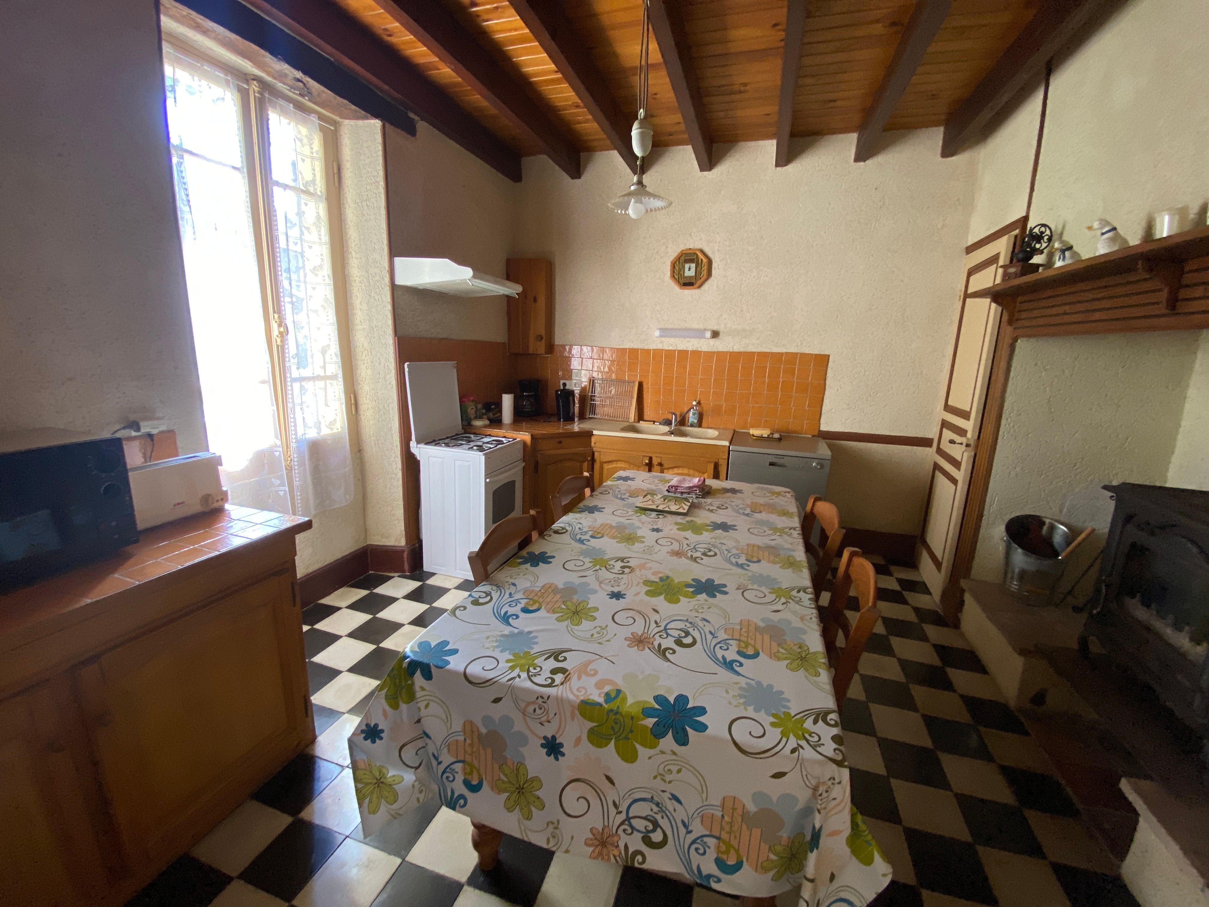 Planta baja: 1 pasillo central grande, cocina (microondas, lavavajillas), sala de estar (sofá, 2 sillones, chimenea, TV), 2 dormitorios (1 cama doble), baño con ducha, WC separado.