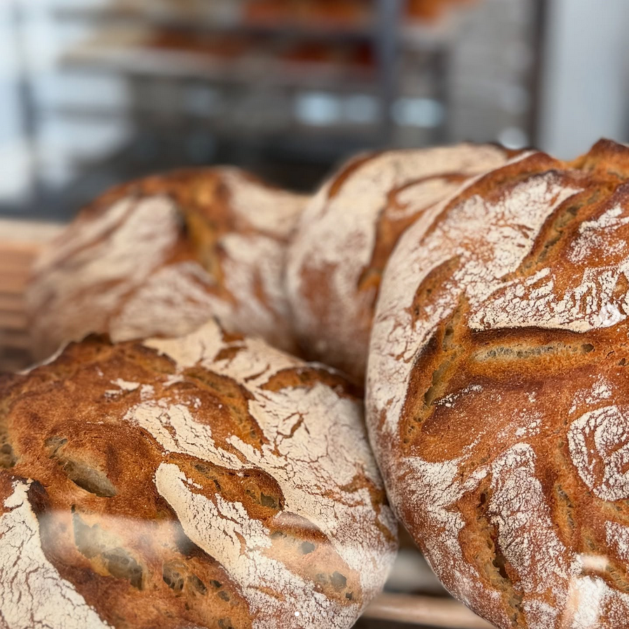 Les pains sont fabriqués sur place dans four à bois à partir de blés anciens sur levain naturel.