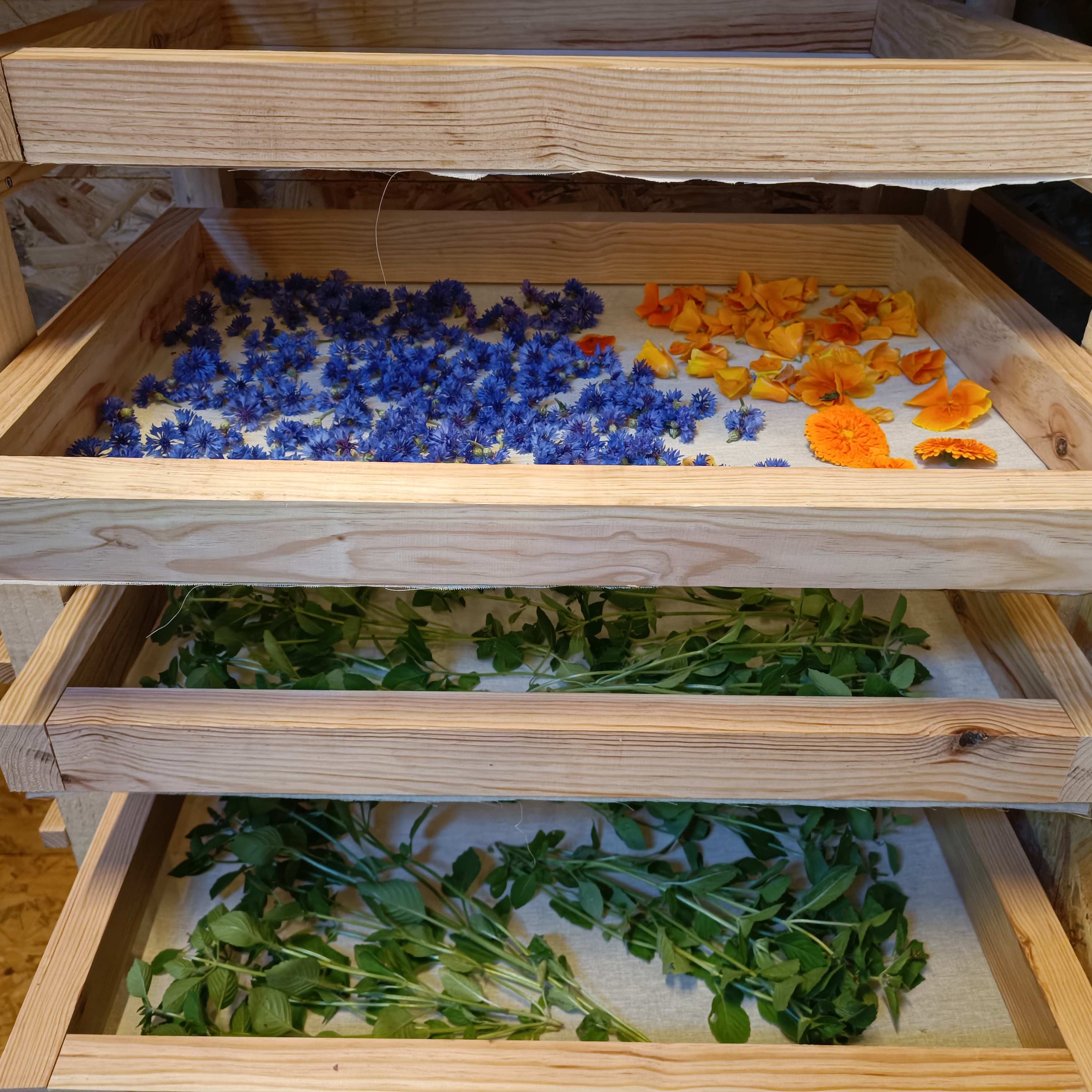 Cueillis à l’état sauvage sur la propriété : pâquerette, ronce, laurier noble, vigne rouge, sureau, plantain, ortie, tilleul, eucalyptus ; j’implante au jardin : lavandes, thyms, sauge, romarin, camomille, menthes, mélisse, sarriette, verveine, bleuet, calendula, escholtzia, mauve, hélichryse, achillée millefeuille, millepertuis, hysope, bourrache, guimauve, valériane, réglisse, roses, bouillon blanc…