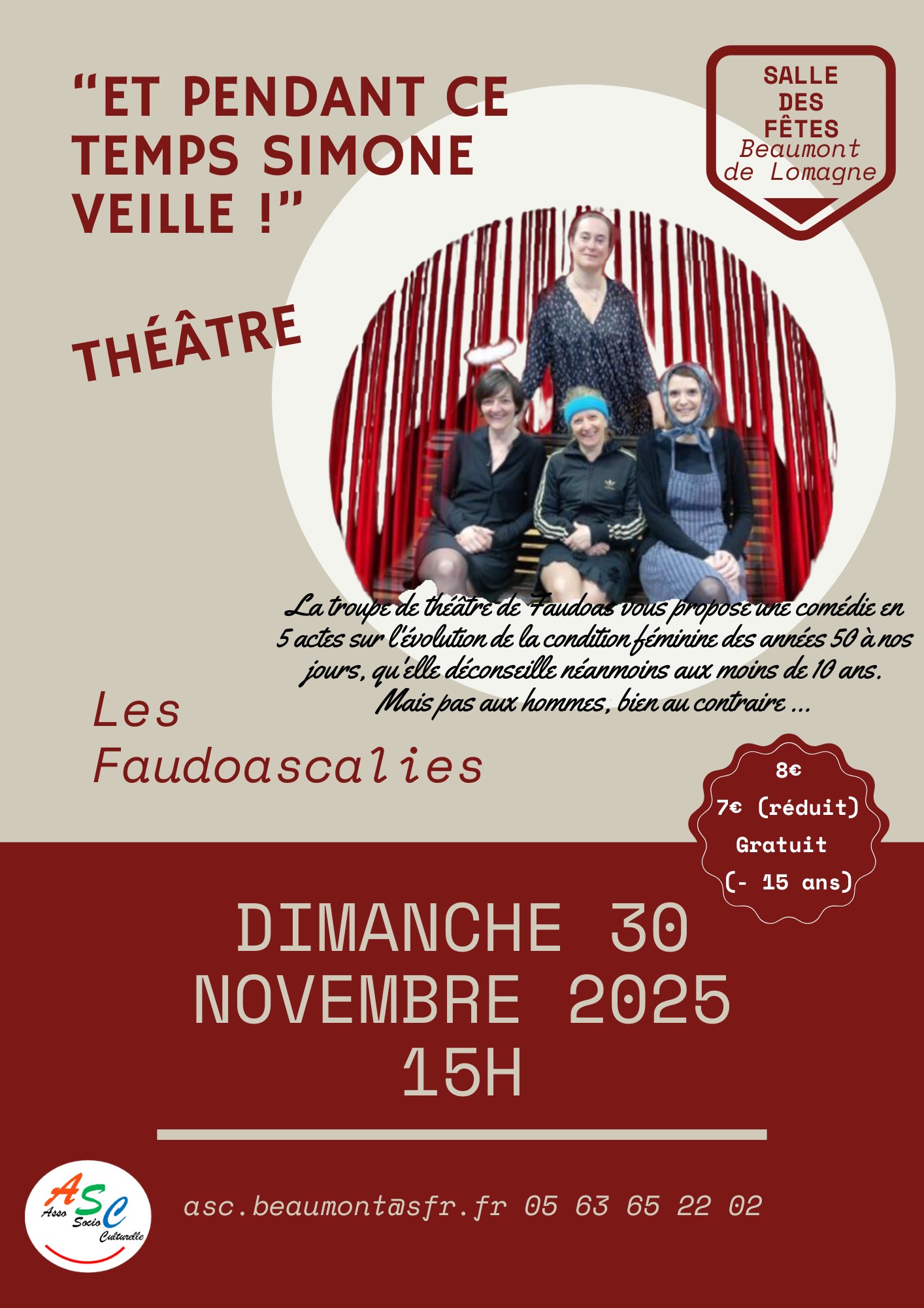 « Et pendant ce temps, Simone veille! » raconte, de manière un peu potache, l’évolution de la condition féminine depuis les années « 50 » jusqu’à nos jours. Les tableaux s’enchaînent et mettent en scène successivement trois femmes et leurs descendantes sur trois générations. Et tout à coup, chacun des spectateurs face à ce pan de notre Histoire reconnaît qui une voisine, qui une grand-tante, qui une cousine… qui une fille. Les rires fusent tant les répliques sont drôles et efficaces. Mais l’émotion est aussi palpable, surtout lorsque la fragilité des acquis des femmes nous revient en pleine figure. Interprétée par des comédiennes locales (de Faudoas) au service d’une mise en scène ingénieuse, cette pièce est un moment agréable à partager, entre rire et nostalgie.