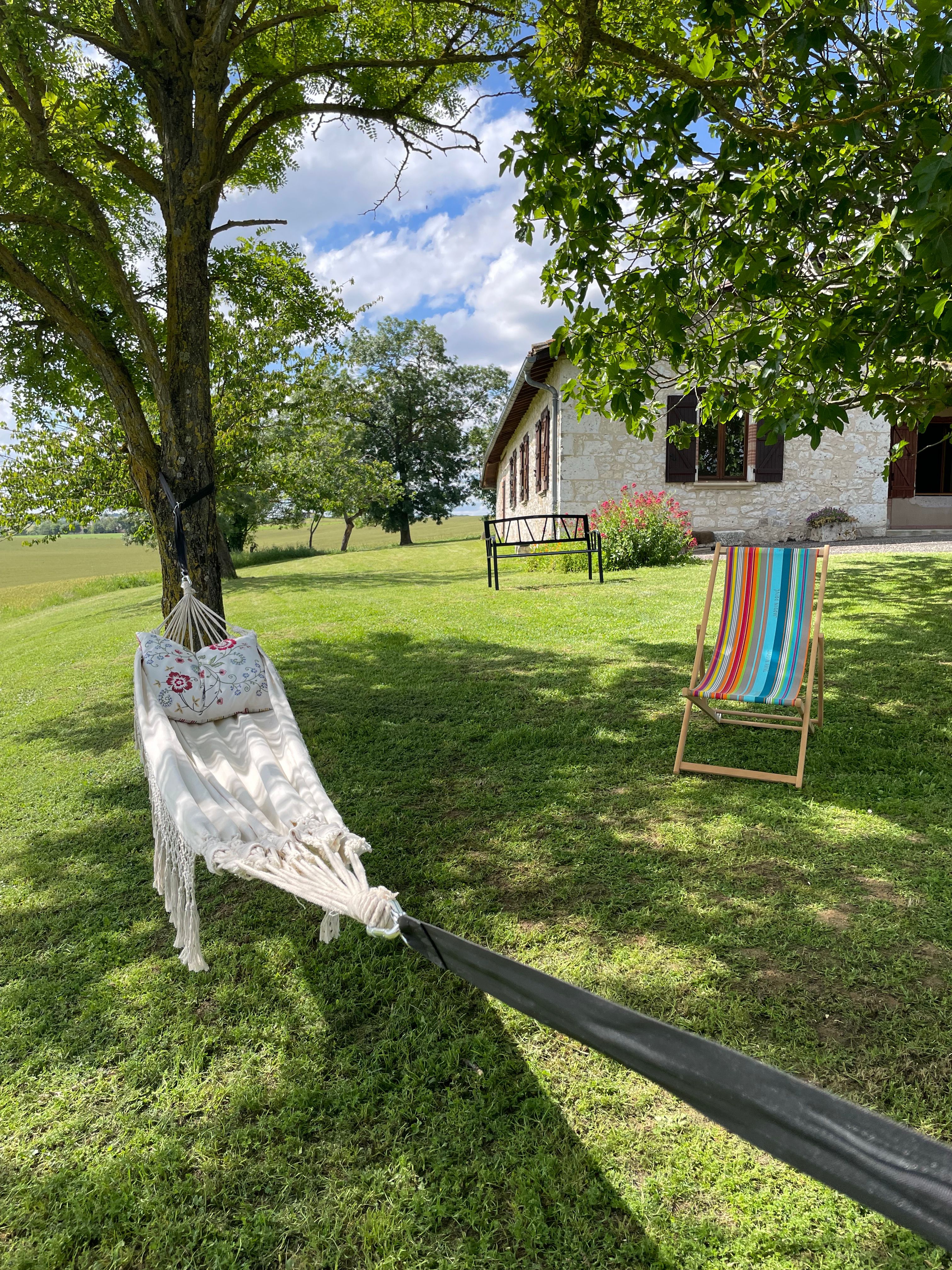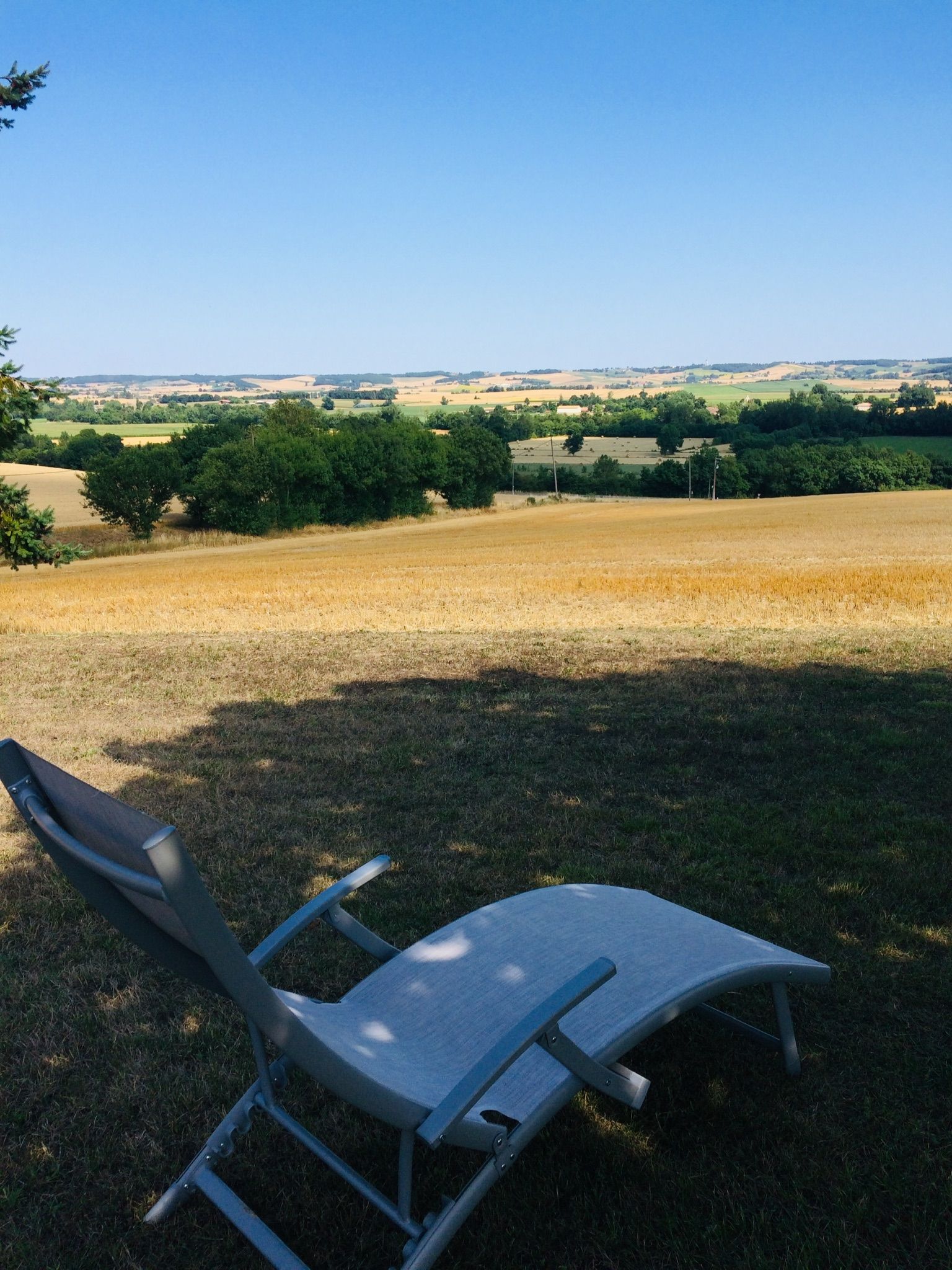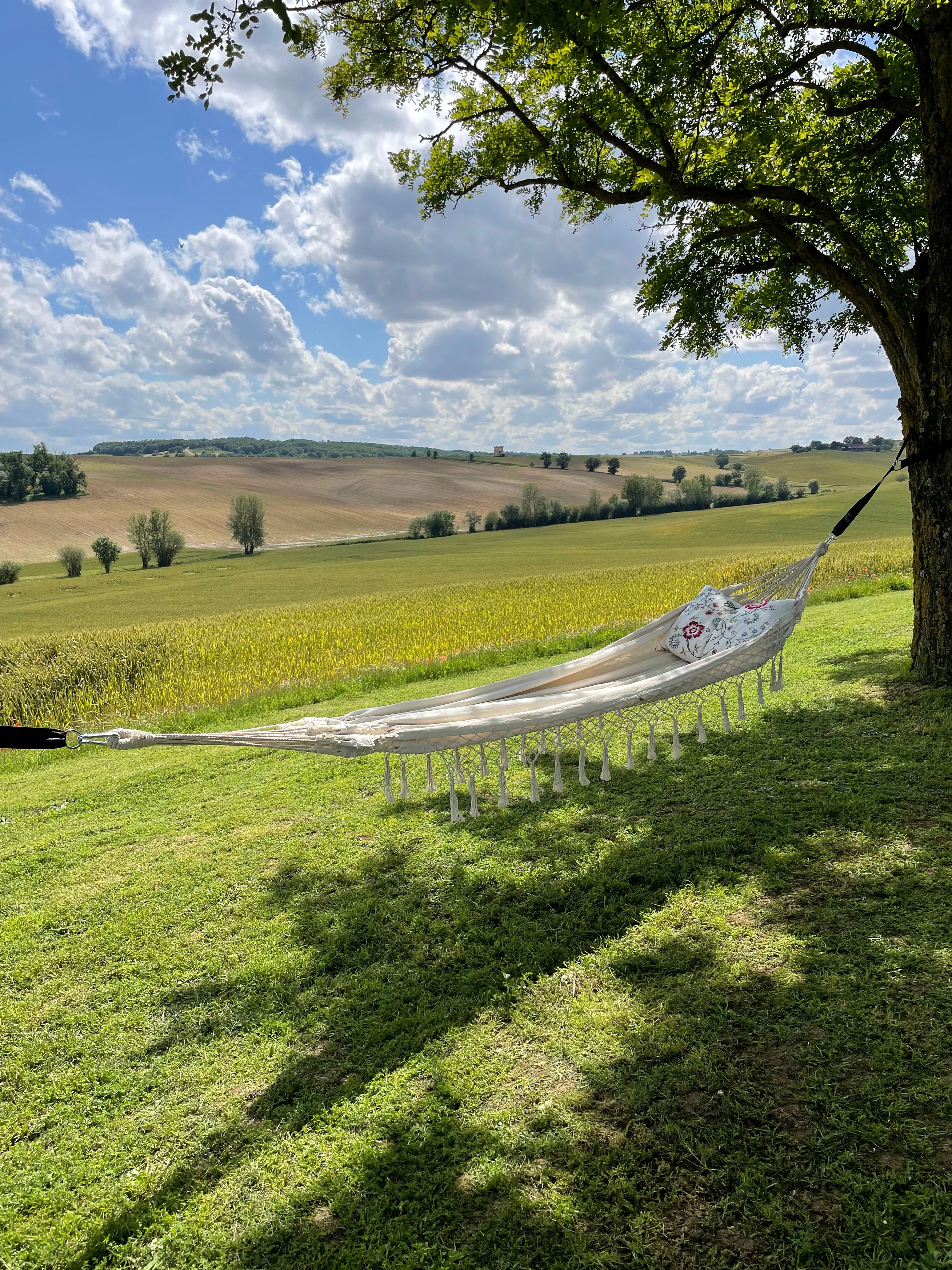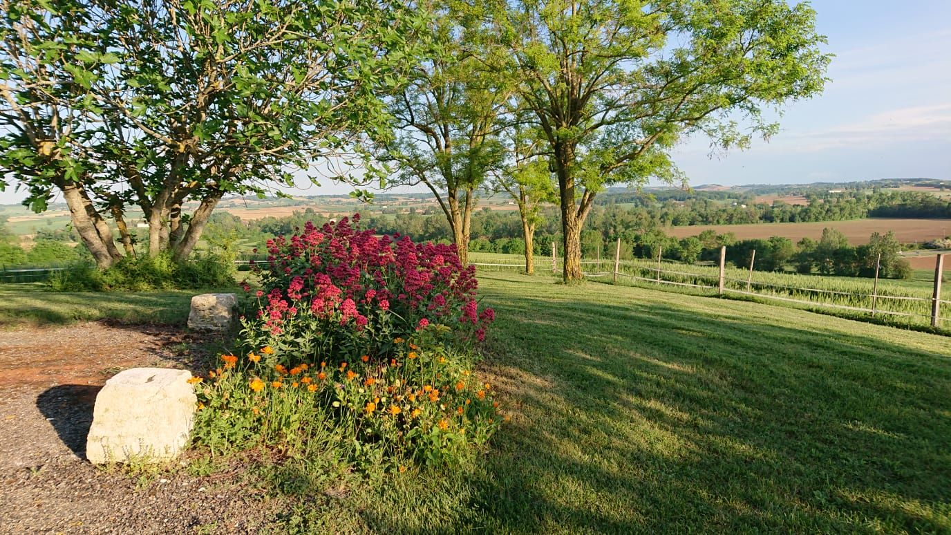 ❤️ ON AIME : le grand parc avec vue sur les coteaux de Lomagne, les espaces ombragés autour du gîte, la salle de bain spacieuse avec double vasques et douche à l’italienne.